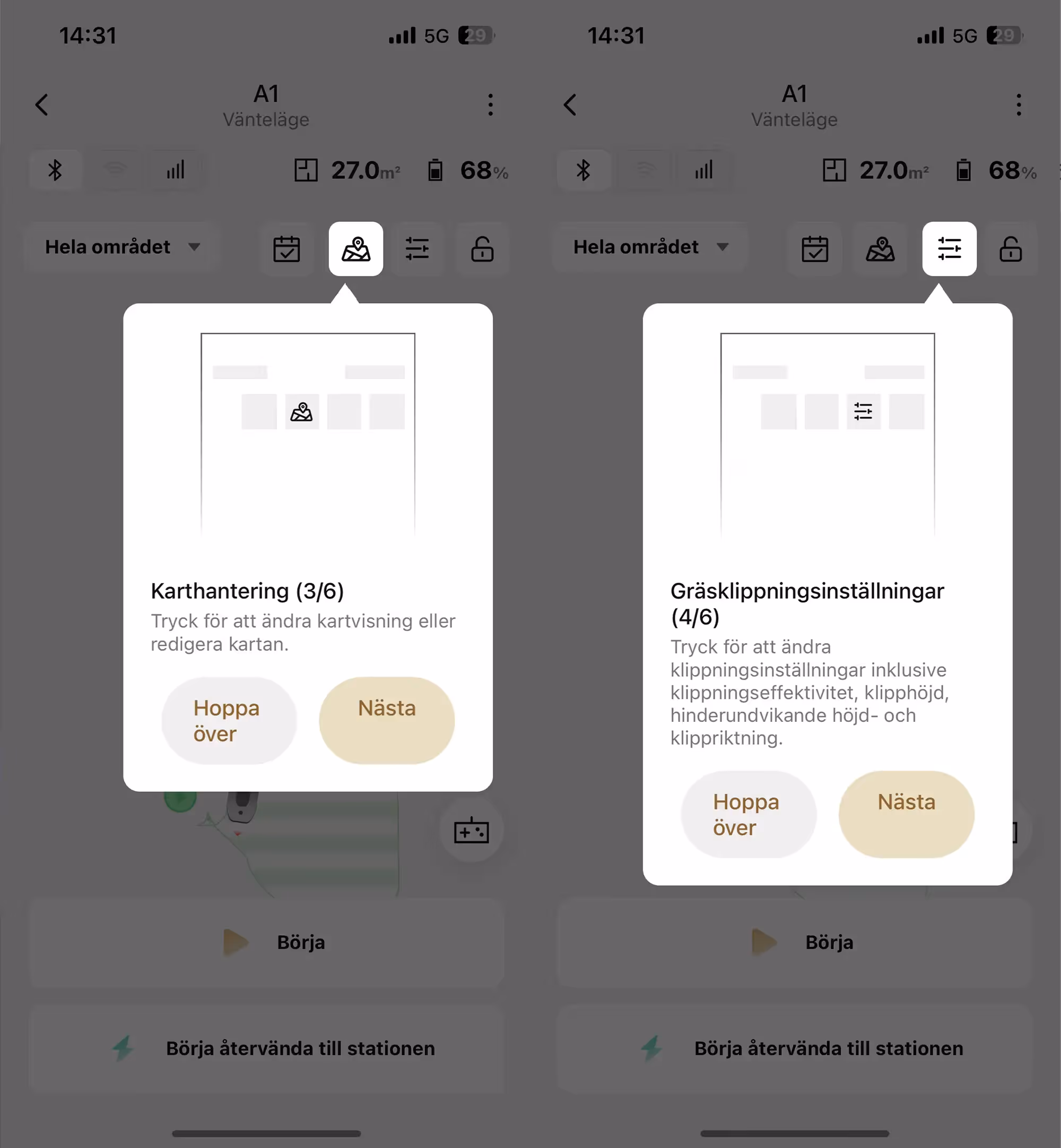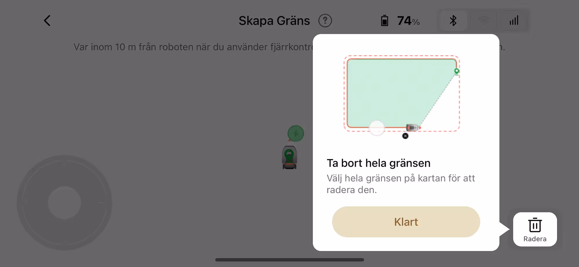 När du kartlägger din gräsmatta för att skapa din första zon så går du helt enkelt bakom roboten och styr den med appen. Medurs eller moturs, spelar ingen roll. När du tagit hela varvet runt så är det dags att skapa en väg till din dockningsstation såvida den inte är placerad innanför zonen. Därefter markerar du förbjudna områden inom din zon på precis samma sätt.
