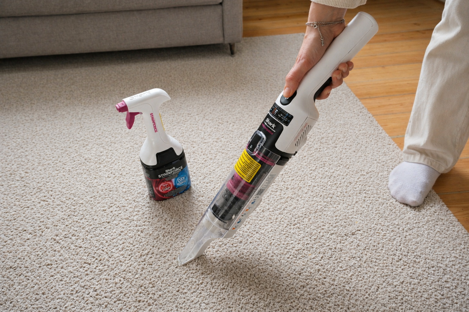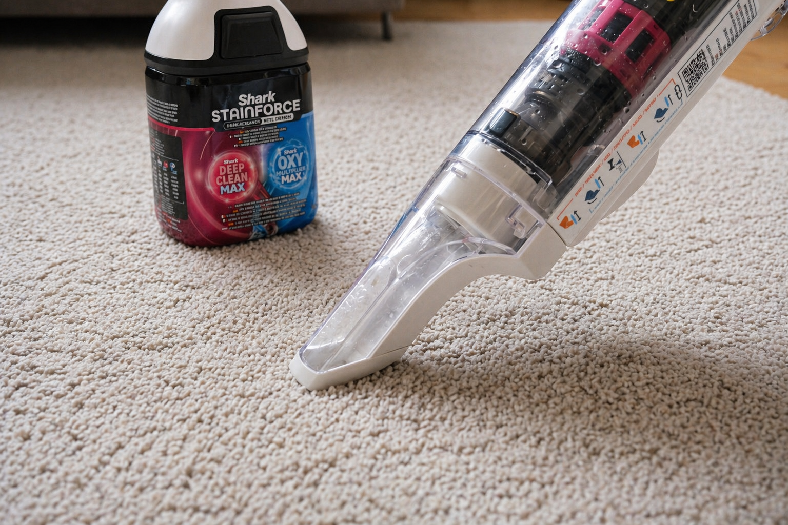 Shark StainForce HX101 är en sladdlös portabel fläcktvätt som bearbetar fläcken med sin borste och sedan suger upp vätska och smuts. Tillverkaren beskriver den som en low moisture-lösning för vardagliga spill, och det stämmer ganska väl med hur vi upplever den i praktiken. Den är gjord för punktinsatser, inte för att tvätta hela mattor eller större sammanhängande ytor.