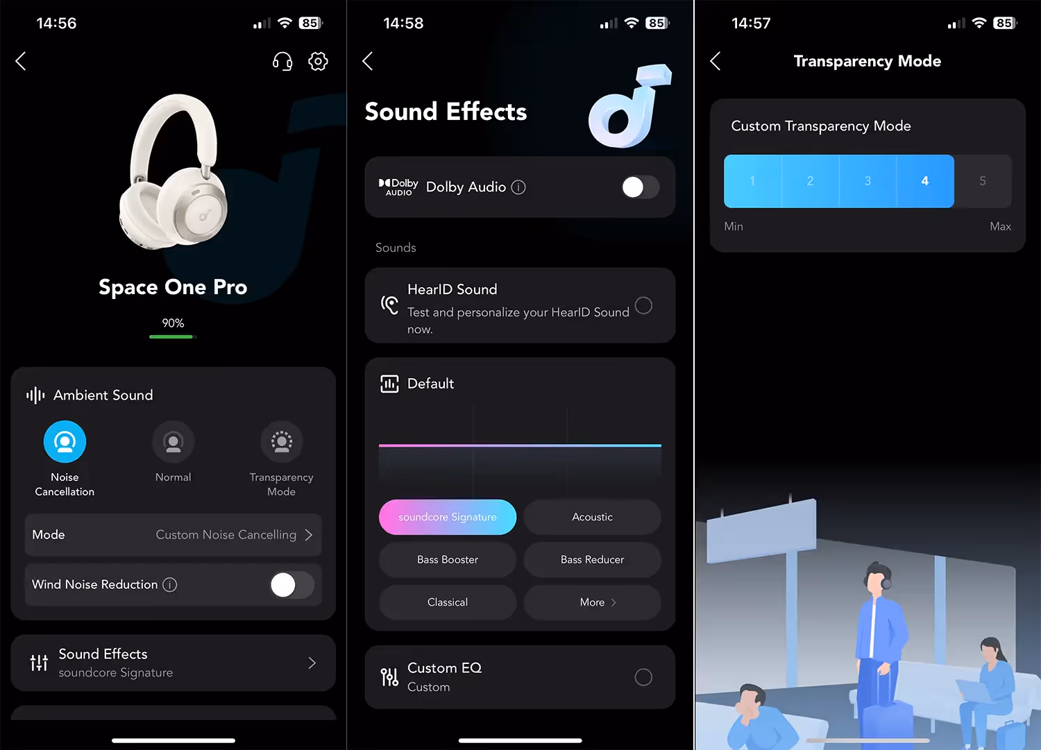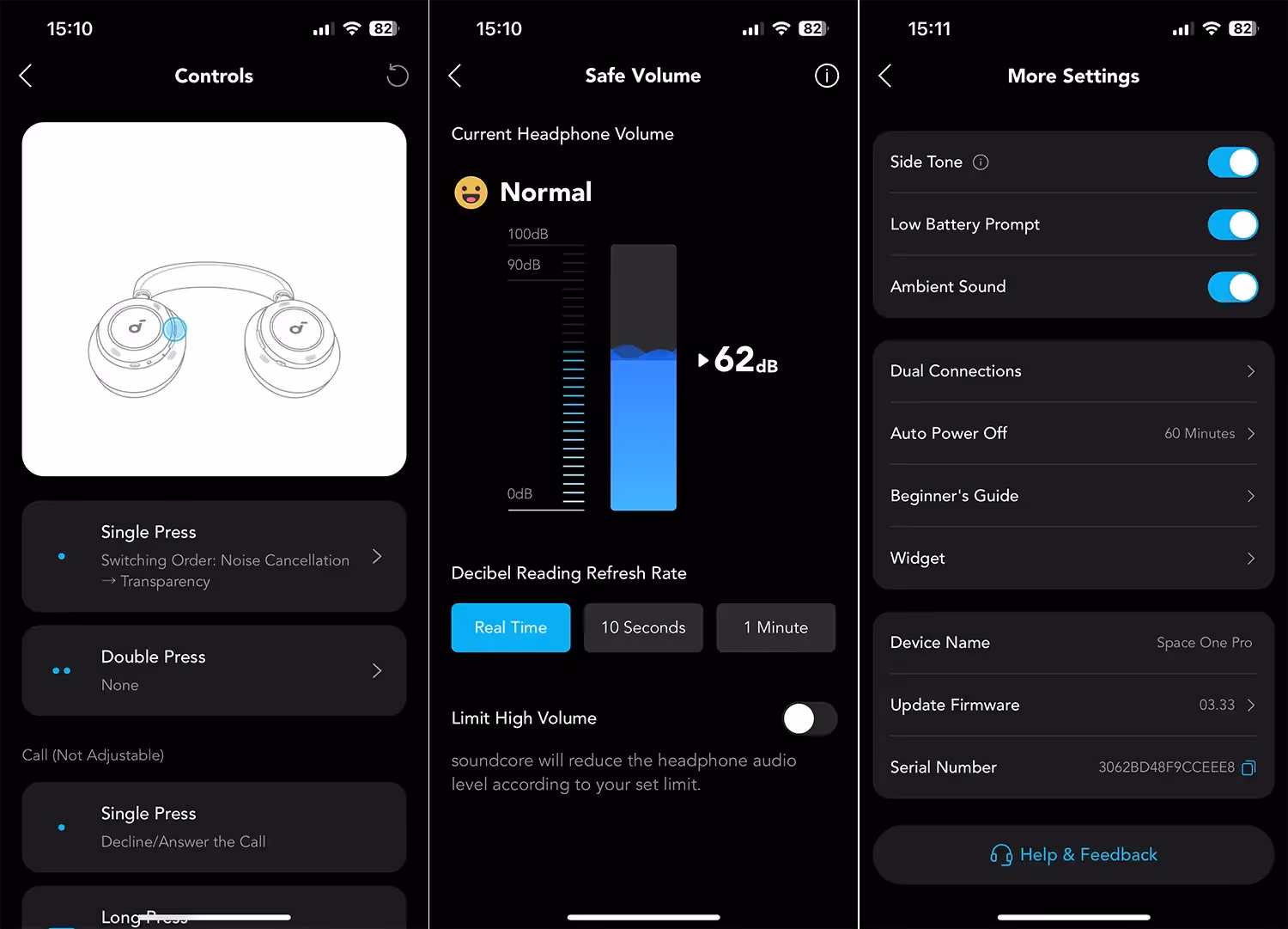 Space One Pro är utrustade med 40 mm-element som levererar ett ljud med en tydlig betoning på basfrekvenserna. För användare som föredrar en mer balanserad ljudbild kan detta upplevas som lite överväldigande. Lyckligtvis erbjuder Soundcore-appen en anpassningsbar 8-bands equalizer, vilket möjliggör justering av ljudprofilen efter individuella preferenser.