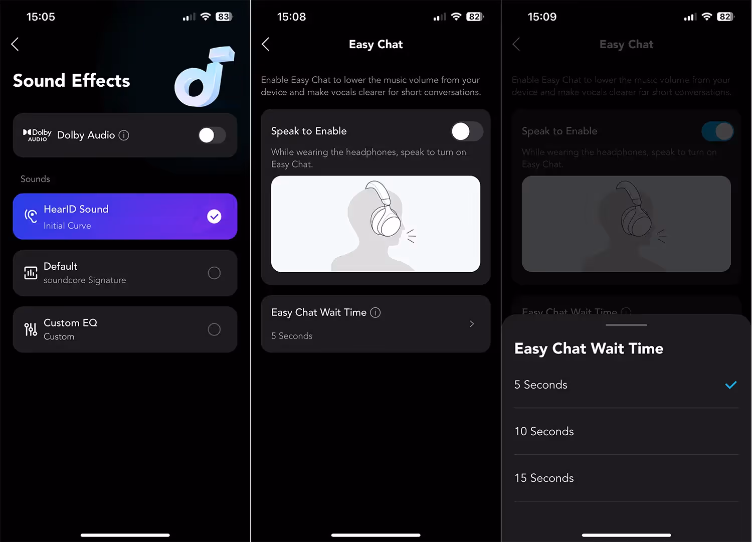 Soundcore-appen erbjuder en rad funktioner, inklusive anpassningsbara EQ-inställningar och möjligheten att justera intensiteten på både ANC och transparenslägen. En “Easy Chat”-funktion sänker automatiskt volymen när användaren börjar prata, vilket underlättar konversationer utan att behöva ta av sig hörlurarna.