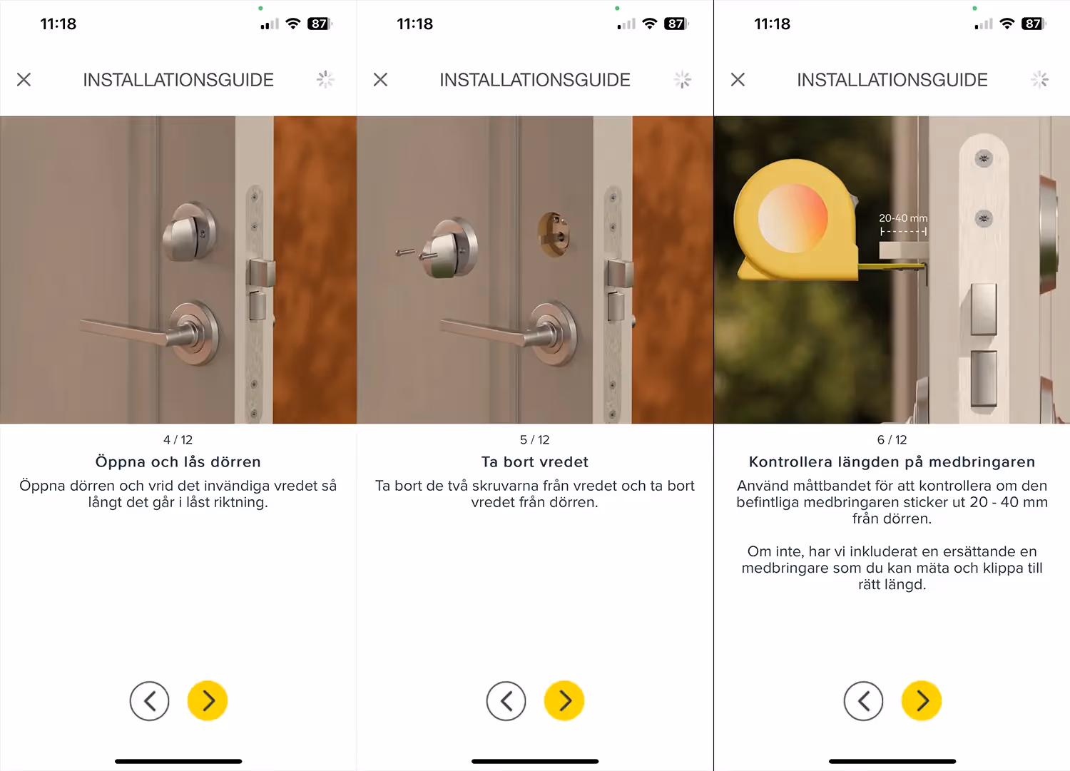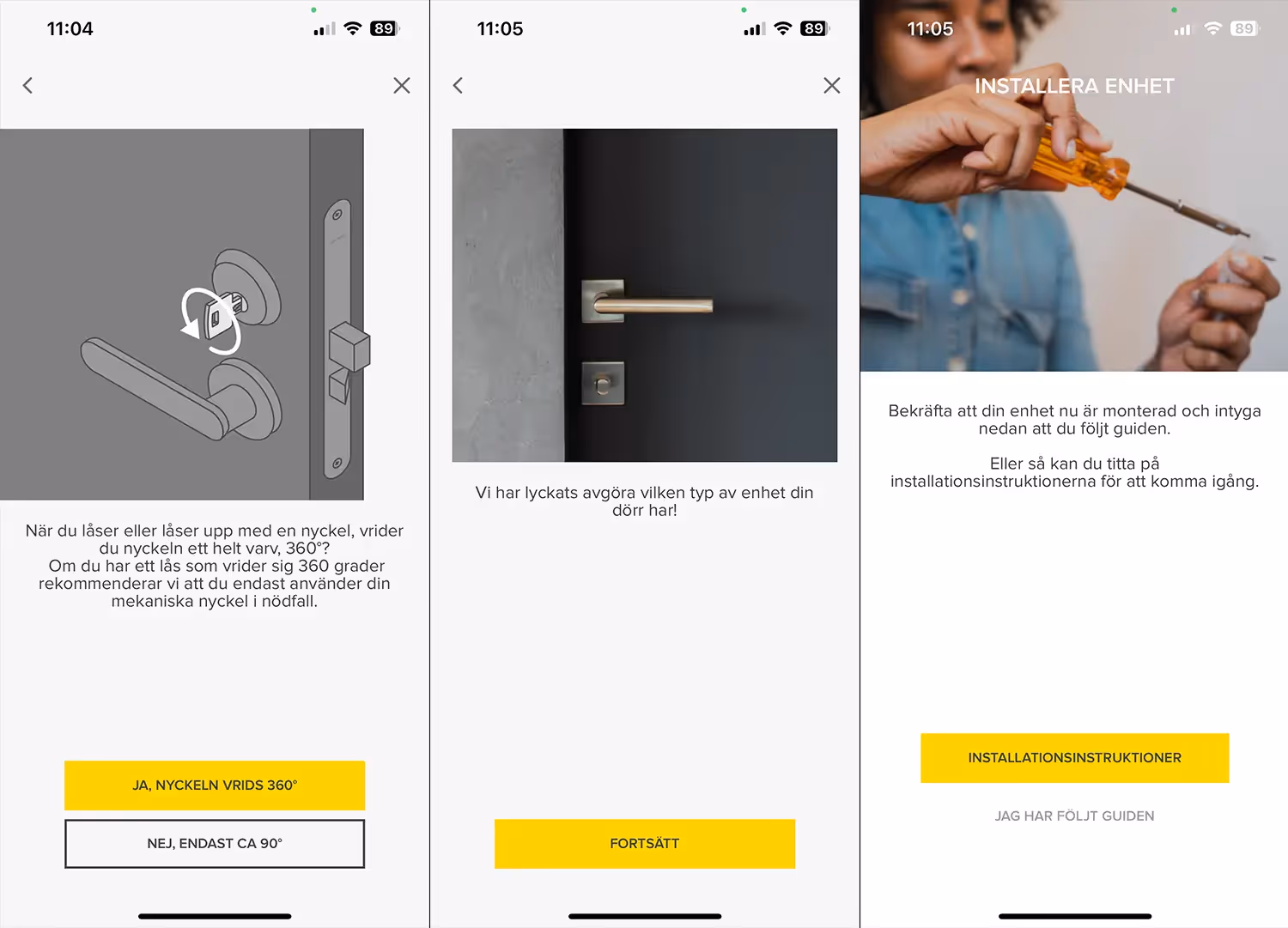 Som vi tidigare nämnde så går det smärtfritt och snabbt att installera, mycket tack vare den pedagogiska guiden som dyker upp i Yale Home appen. Även den som känner att det skulle vara lite läskigt att börja skruva i ett befintliga lås klarar denna installation utan problem. Appen ställer ett par frågor för att ta reda på vilket typ av lås du har för att sedan ge rätt instruktioner.