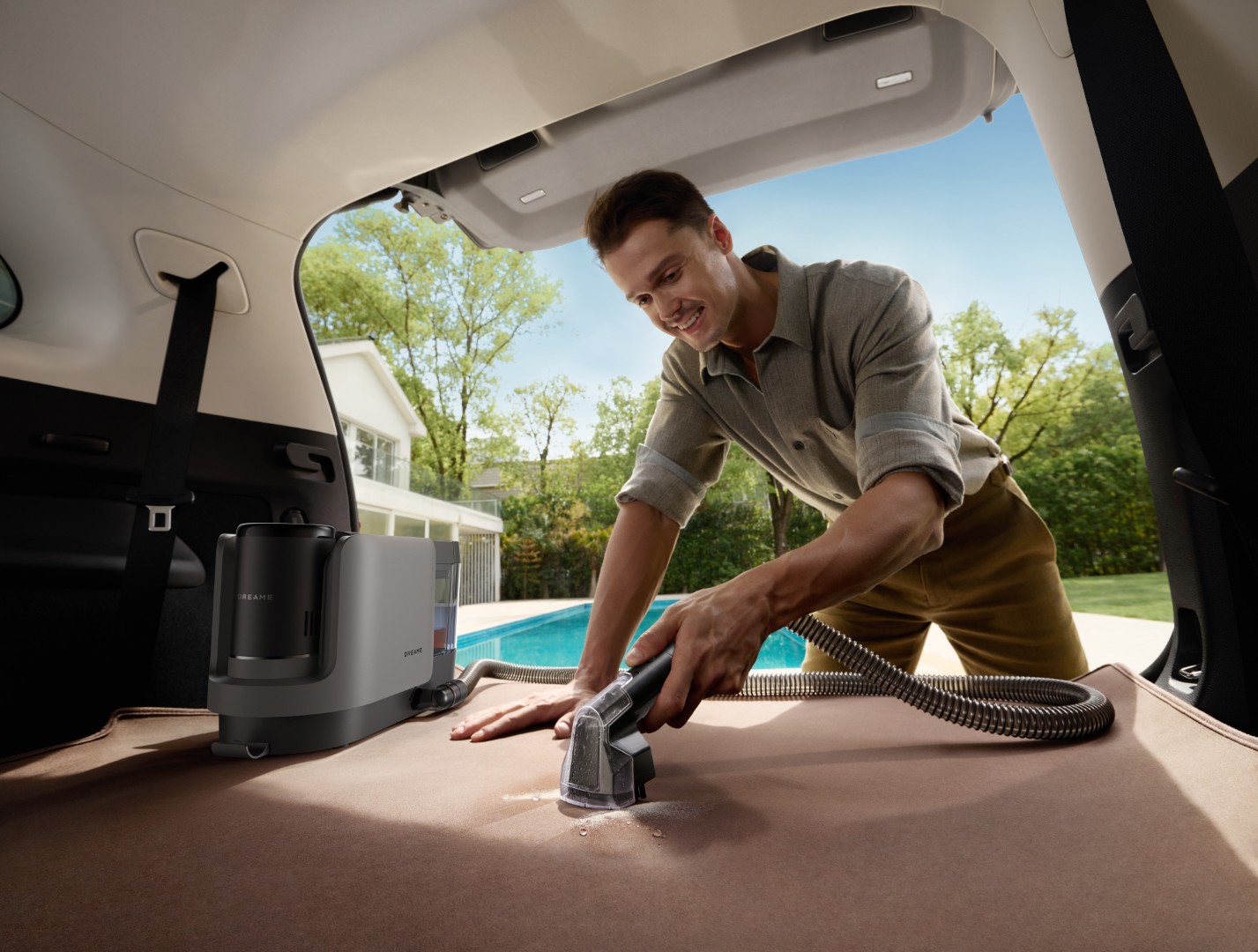 Carpet Spot Cleaner-delverktyget använder varmvatten och en speciell formula för att ta bort fläckar och lukt från mattor och textilier med minimal fuktighet. Slang och borstar kan rengöras med ett knapptryck utan manuell sköljning.