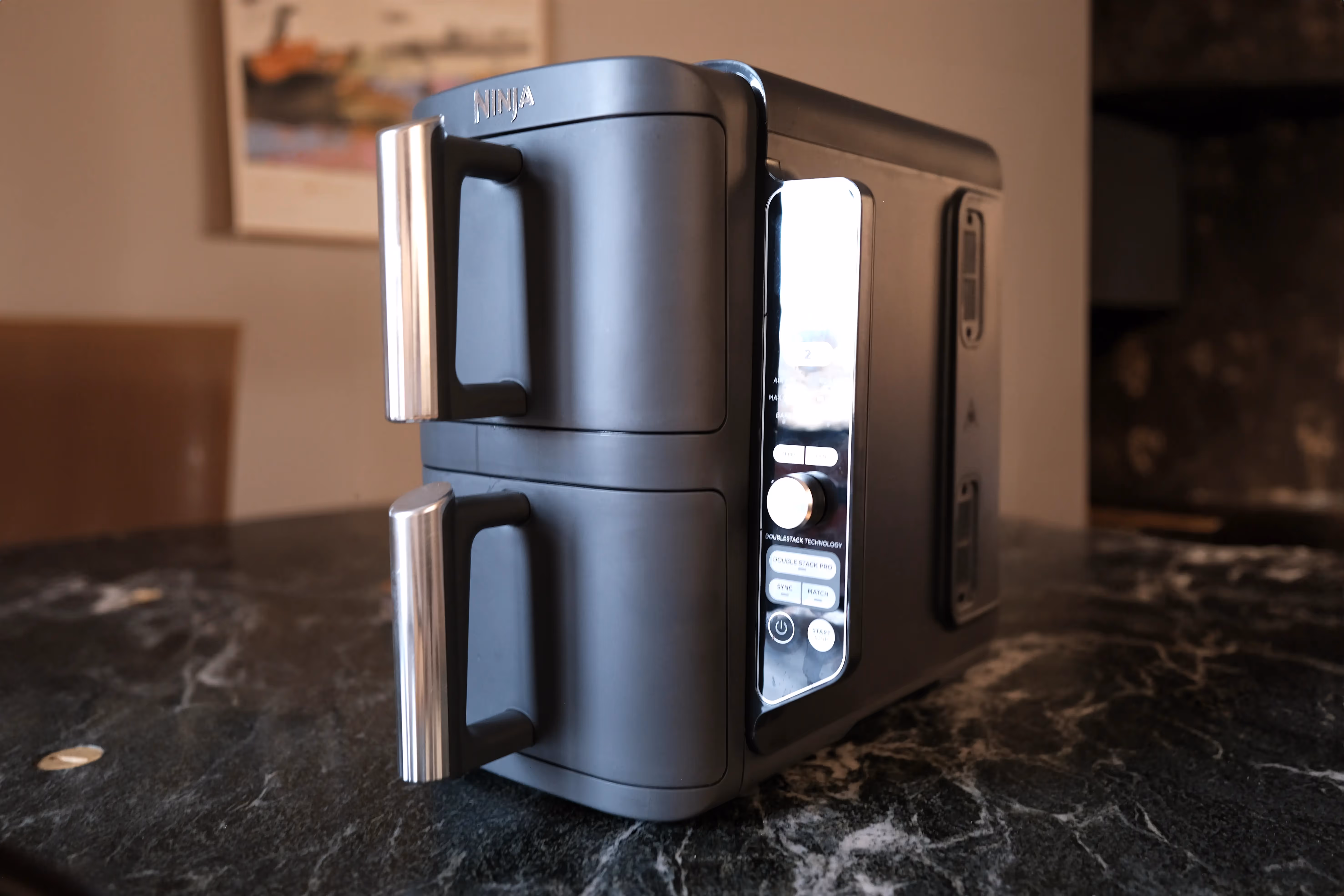 Ninja Double Stack XL är en airfryer som utmärker sig med sin kapacitet och mångsidiga funktioner, vilket gör den idealisk för större hushåll eller för dig som vill laga flera rätter samtidigt. Med en total kapacitet på 9.5 liter och två separata matlagningsfack kan du tillaga olika rätter parallellt med individuella inställningar. Maskinens design är robust och funktionell med en digital kontrollpanel som är lätt att använda.